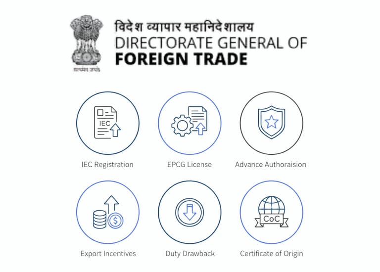 Complete DGFT solutions including IEC, Advance Authorisation, EPCG, RODTEP, MEIS, SEIS, Export House Certification, RCMC, COO & Digital Signatures.